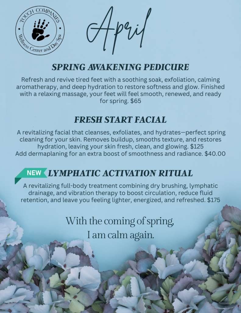 Welcome Spring with Renewal and RelaxationRefresh your body and mind this season with our Spring Awakening treatments—soothing pedicures, revitalizing facials, and full-body lymphatic activation to leave you feeling renewed, glowing, and energized.